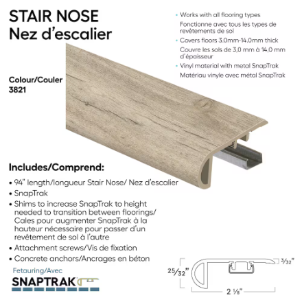 Stair Nosing is designed for installation on the edge of a stair tread. Stair nosing adds beauty to your home while absorbing much of the staircase traffic. Coordinates with vinyl flooring, trim and moldings. The stair nosing provides a beautiful finished look to your home.